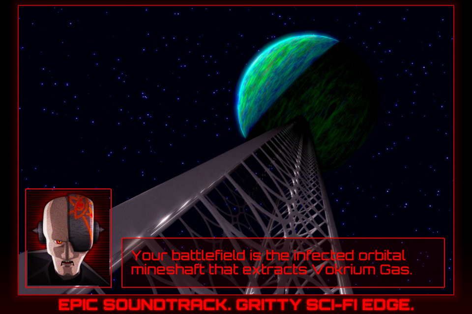 Welcome to Vokria, the fourth and most coveted moon of Stratopeia. Your battlefield is the infected orbital mine shaft that extracts Vokrium gas, the backbone of the Stratopeian transport infrastructure. Take command of your Ambi-ON eradication unit to purge the mine shaft of the swelling parasitic threat.